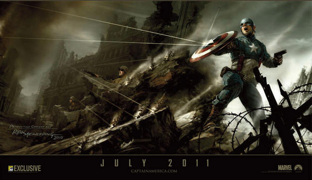 Director Joe Johnston hit the con with the rest of the cast to talk about Captain America and to screen a sizzle reel that contained costume test shoots and a 1940s style voiceover. The film takes place in the 40s, giving the character a relatively faithful origins story and the villain of the piece will be the Red Skull played by Hugo Weaving. The footage isn’t available yet but here’s the film’s official banner and first concept poster.