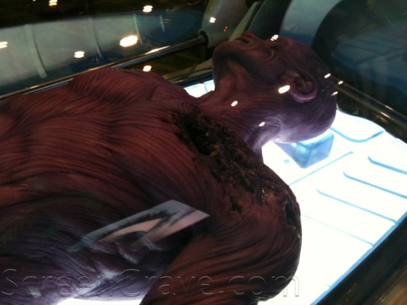 Reynolds also let slip – whether he was supposed to or not – that the character Parallax will also appear in the movie. Meanwhile, out on the con floor, there was an impressive prop of Abin Sur from the movie showing the figure lying down in a glass case, image taken by ScreenCrave.com: