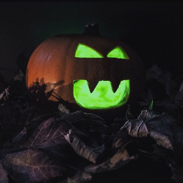 A more classic Halloween pumpkin with a couple of green glow sticks inside surrounded by autumn leaves.